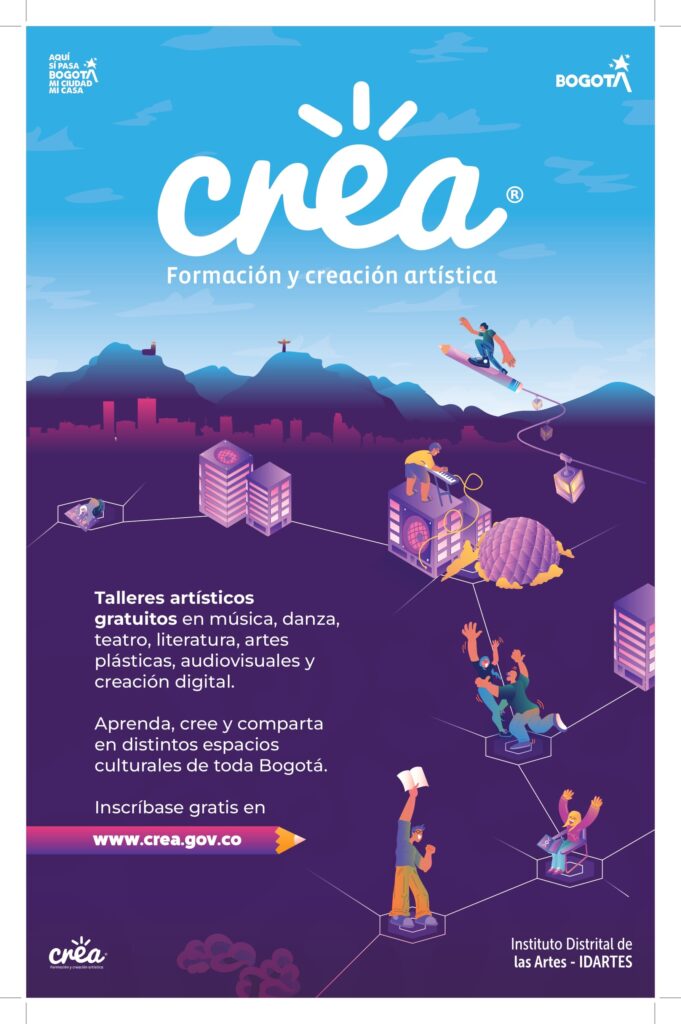 Los procesos formativos se desarrollan en los Centros de Formación Crea, una red de espacios culturales activos —distribuidos en 13 localidades de Bogotá— que fortalecen el ecosistema artístico de la ciudad desde los territorios. Con presencia en distintas zonas de la capital, cada centro funciona como un punto de creación en el que el aprendizaje se entiende como práctica constante: ensayar, escribir, interpretar, diseñar y experimentar son parte del camino formativo.