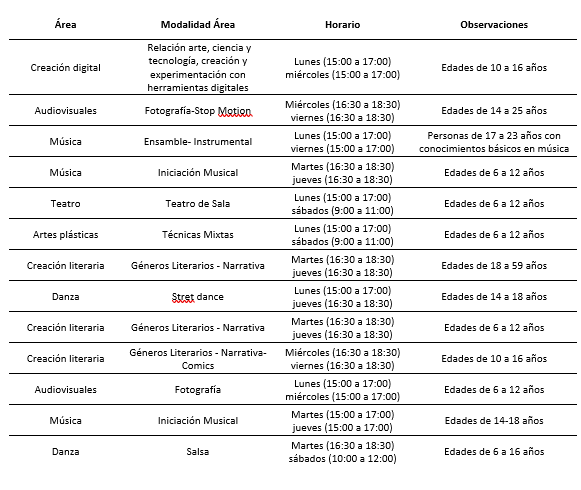 Nuestra misión es potenciar la creatividad en la comunidad. Descubre a continuación nuestras áreas y horarios para este ciclo: