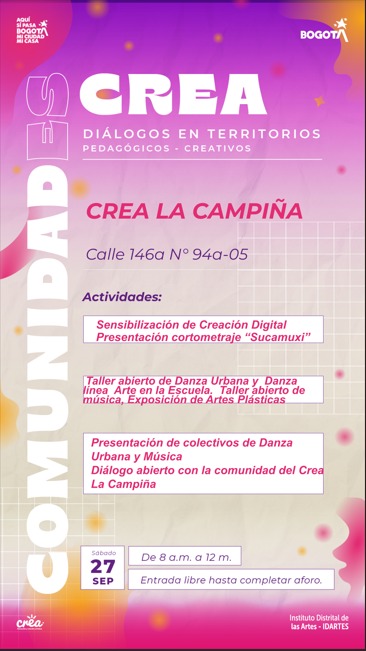 El Crea La Campiña te invita al evento ComunidadEs Crea, un espacio en el que el programa Crea abre sus puertas a todo el público y será un momento dedicado a celebrar, reconocer y dar voz a las diversas expresiones artísticas que enriquecen nuestra comunidad.