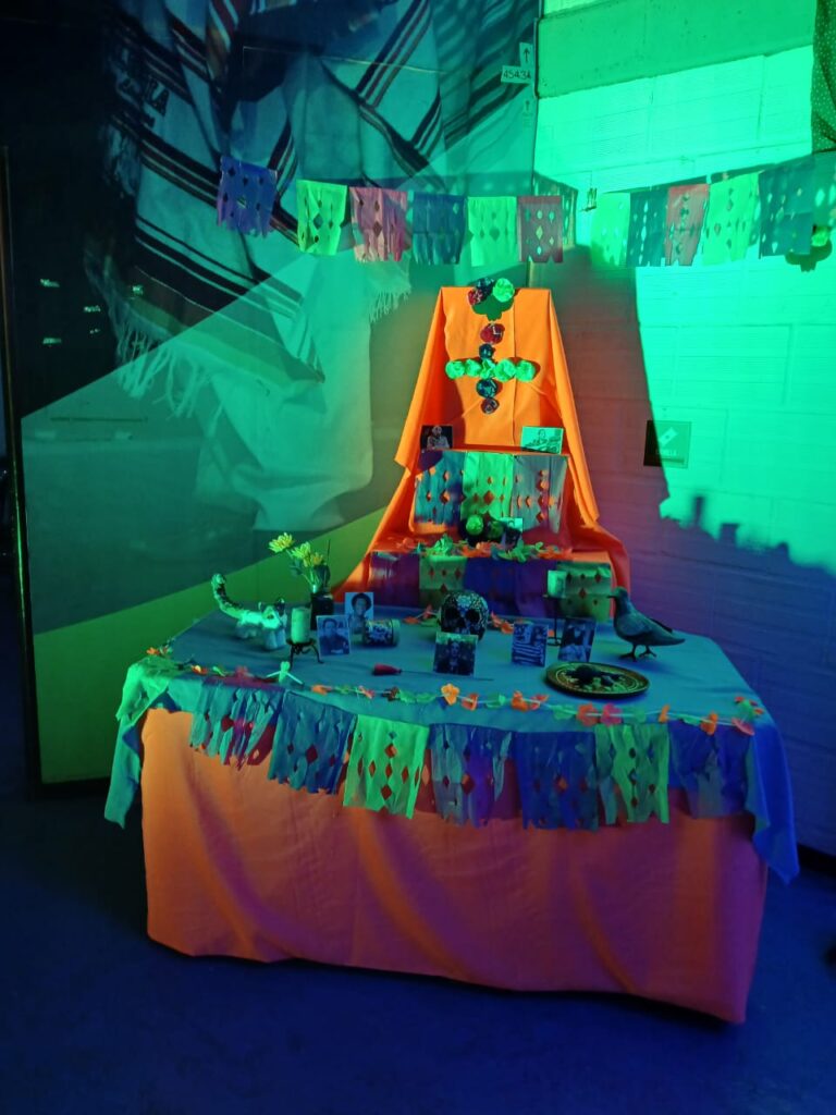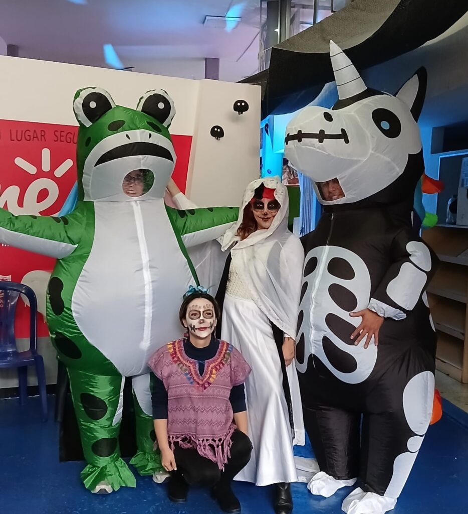 El equipo Crea se sumó a la celebración con entusiasmo, caracterizado como Catrina, Llorona y alebrijes, recibiendo con calidez a las niñas y niños del Colegio Antonio Nariño, quienes participaron activamente en las actividades lúdicas y artísticas.