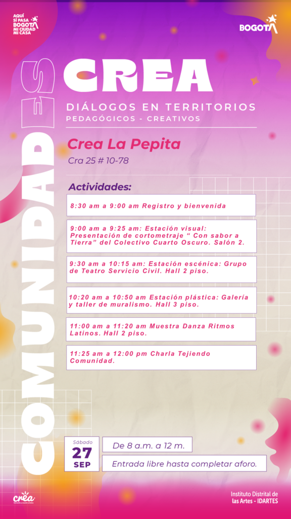 En el Crea La Pepita queremos invitar a todos nuestros participantes, vecinos, familiares, amigos, Artistas Formadores y aliados a visitarnos desde las 8:30 am, hacer parte de nuestra experiencia en donde tendremos: Proyección de Cortometraje “Con sabor a Tierra” del Colectivo Cuarto Oscuro, muestra escénica del grupo de Teatro de Servicio Civil, taller de muralismo, exposición Arte y Ciudad, Conversatorio con comunidad y entidades aliadas y muuucho más.