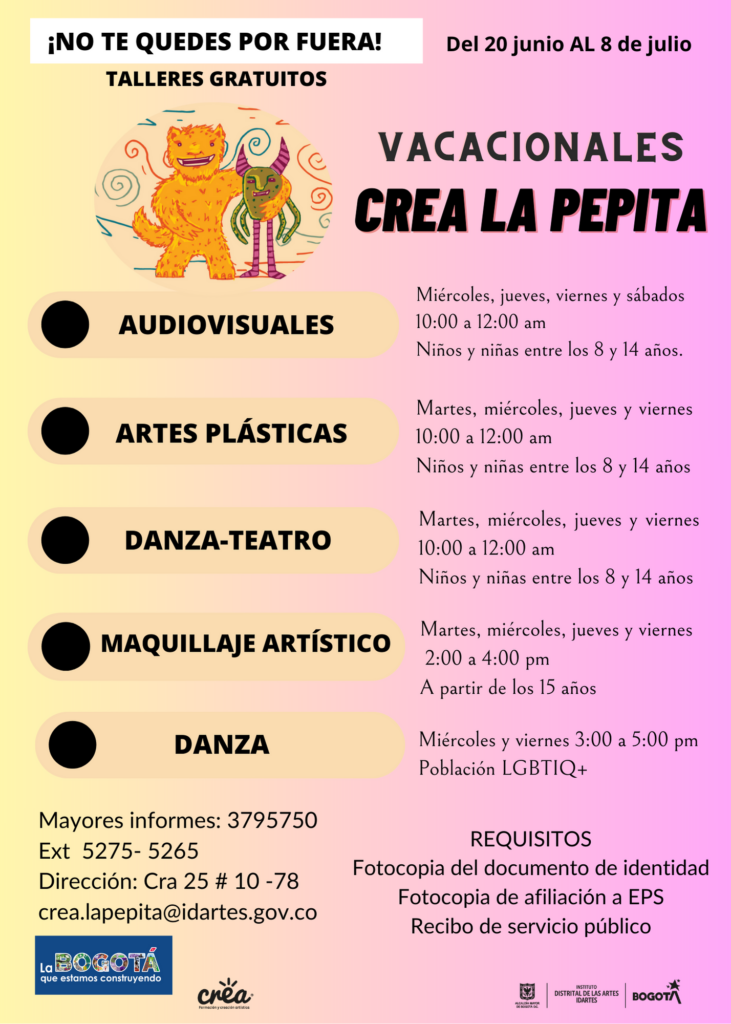 Inscripciones totalmente gratis en la pagina web: https://sif.idartes.gov.co/sif/framework/crea/territorial/oferta/oferta-disponible