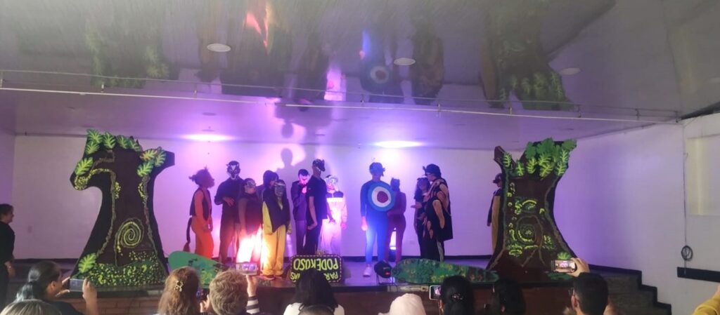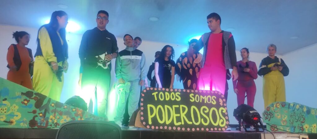 Máscaras, colores y objetos que emergen para dar vida a una propuesta escénica hermosa a partir del cuento El más poderoso, de Keiko Kasza – dejaron un mensaje de profunda reflexión, cargado de emociones y de las mismas personalidades de los actores y actrices, quienes prestaron parte de sí a los personajes. Estos, a su vez, llevaron al público a reconocer que en cada persona presente hay un poder valioso y que, por tanto, TODOS SOMOS PODEROSOS. Amenizaron su propuesta con canciones y con sonrisas que alegraron el alma no solo de sus familias, sino también de la artista formadora, quien, como una hormiguita, no se detuvo en ningún momento para garantizar que la presentación tuviese el éxito contundente que alcanzó. Mientras corría de un lado al otro, sus ojos brillaban como brilla el alba cada mañana al ver salir el sol, con la satisfacción de sacar a la luz un proceso más, de avivar el último refugio de lo vivo: el convivio, EL TEATRO.