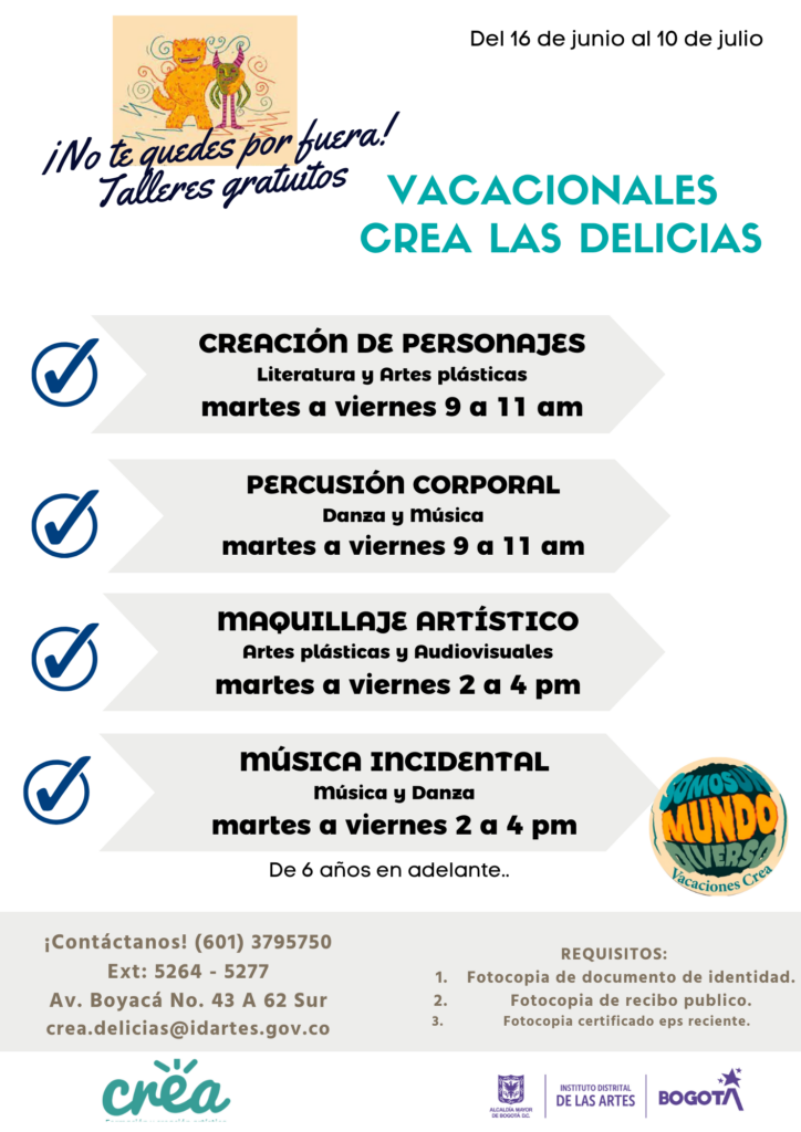 Llego la época más esperada por toda la comunidad, ¡las vacaciones! y el programa Crea y el Crea Las tienen una amplia oferta de talleres artísticos para toda la comunidad. Desde el 20 de junio hasta el 10 de julio estaremos acompañando a todas las personas interesadas en inscribirse.