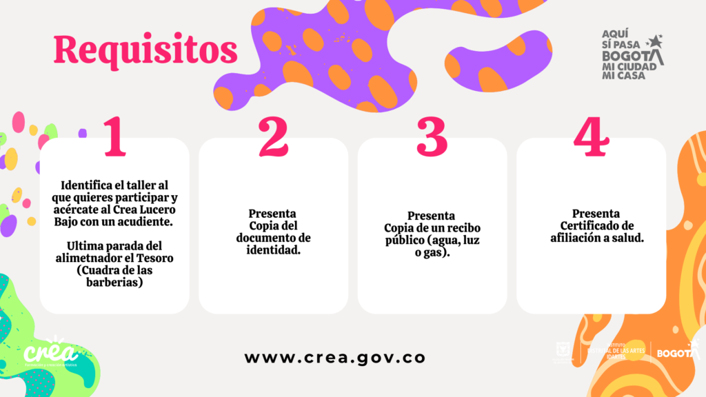 Queremos invitar a todos: niños, niñas, adolescentes, jóvenes, adultos y personas mayores, a disfrutar de nuestra variada oferta artística, ¡totalmente sin costo! Solo necesitas traer tu fotocopia de documento de identidad, un recibo público, tu certificado de afiliación a salud y, lo más importante, ¡tu entusiasmo y mucha creatividad para disfrutar, imaginar y crear!