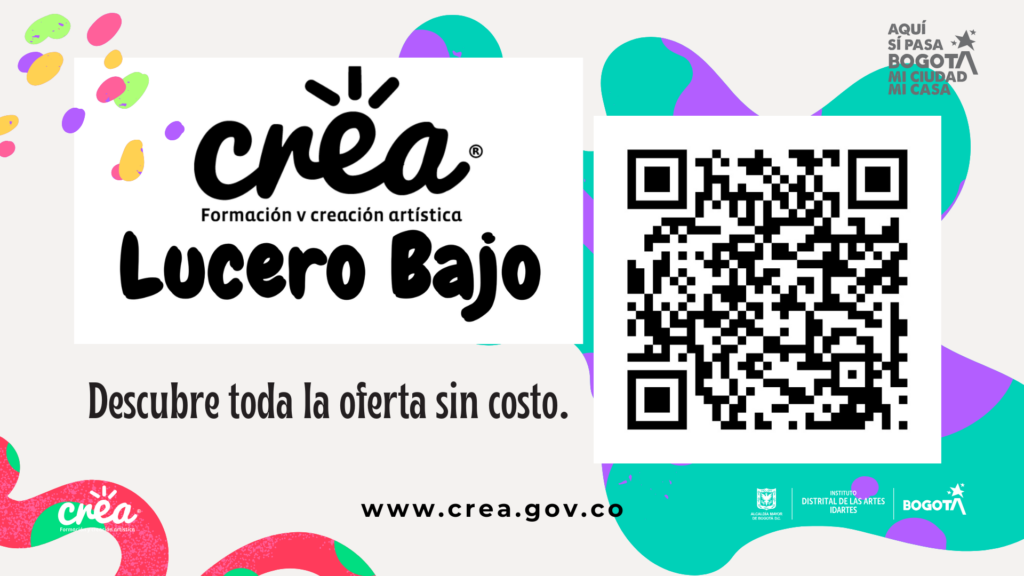 Traemos una maravillosa mezcla de arte, experiencias únicas y procesos formativos que ¡te encantarán! Ven y acompáñanos en el Crea Lucero Bajo un espacio lleno de creatividad y magia, del Instituto Distrital de las Artes – IDARTES.