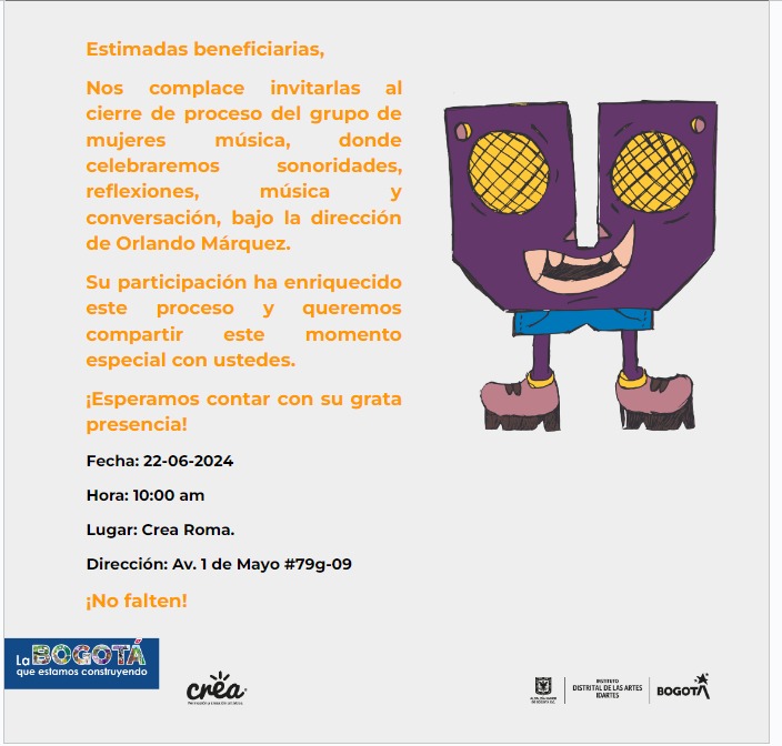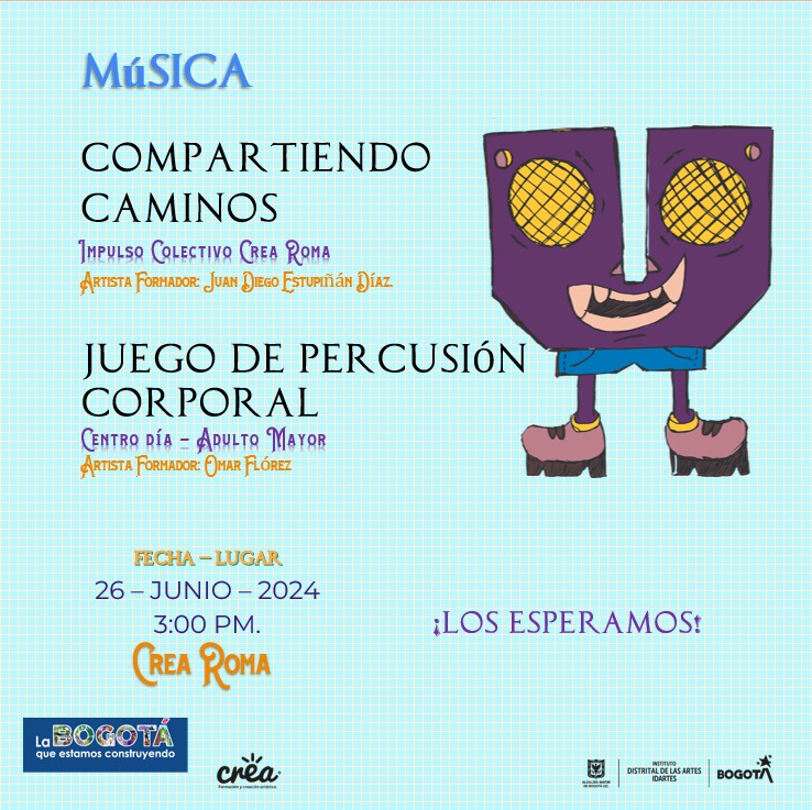 Hola querida comunidad, los invitamos hacer parte de la socialización de procesos durante la semana del 22 al 28 de junio, un espacio abierto a la comunidad, para que vengas con tu familia y disfrutes de un espacio de disfrute y contemplación a través de las artes.
