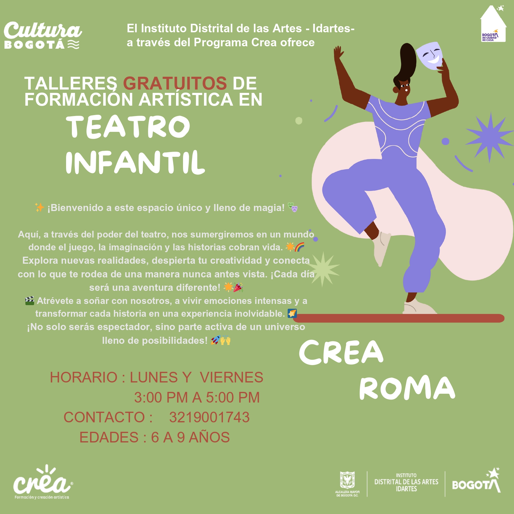 Te esperamos en el Crea Roma para que disfrutes del taller de teatro, dirigido a niños y niñas entre los 6 y 9 años de edad, sera un espacio de juego, creación de historias y muchas aventuras.