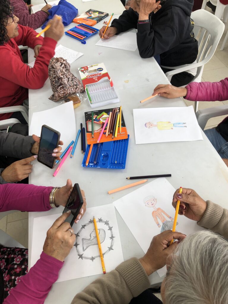 El proceso de podcast con el Centro Día se propuso con actividades de sensibilización y conversación para comenzar los diálogos entre los participantes que luego resultaron en programas cortos. Se hicieron retratos, cartografías afectivas y se buscó reconocer la memoria particular de los participantes, sus historias cotidianas y sus posturas de vida a través de temas que surgieron como la fe, la música, la vestimenta, los cambios culturales, entre otros.
